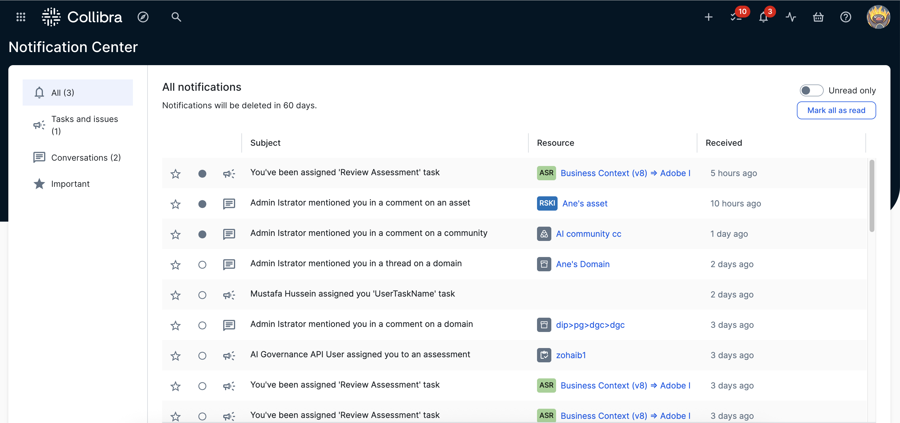 | Conversations | All comments made in Collibra that you have been tagged (@) in or responses in threads that you participated in within the last 60 days. |