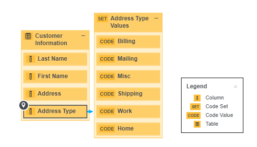 In the following diagram, you can see that the Customer Information table contains the Address Type column, which can only contain code values from the Address Type Values code set.