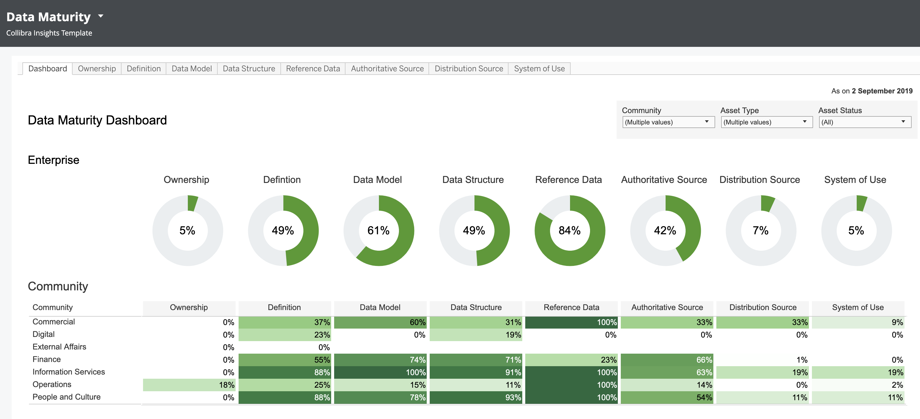 The Data Maturity report helps you to track the completeness of critical assets based on the business dimensions used in an organization.