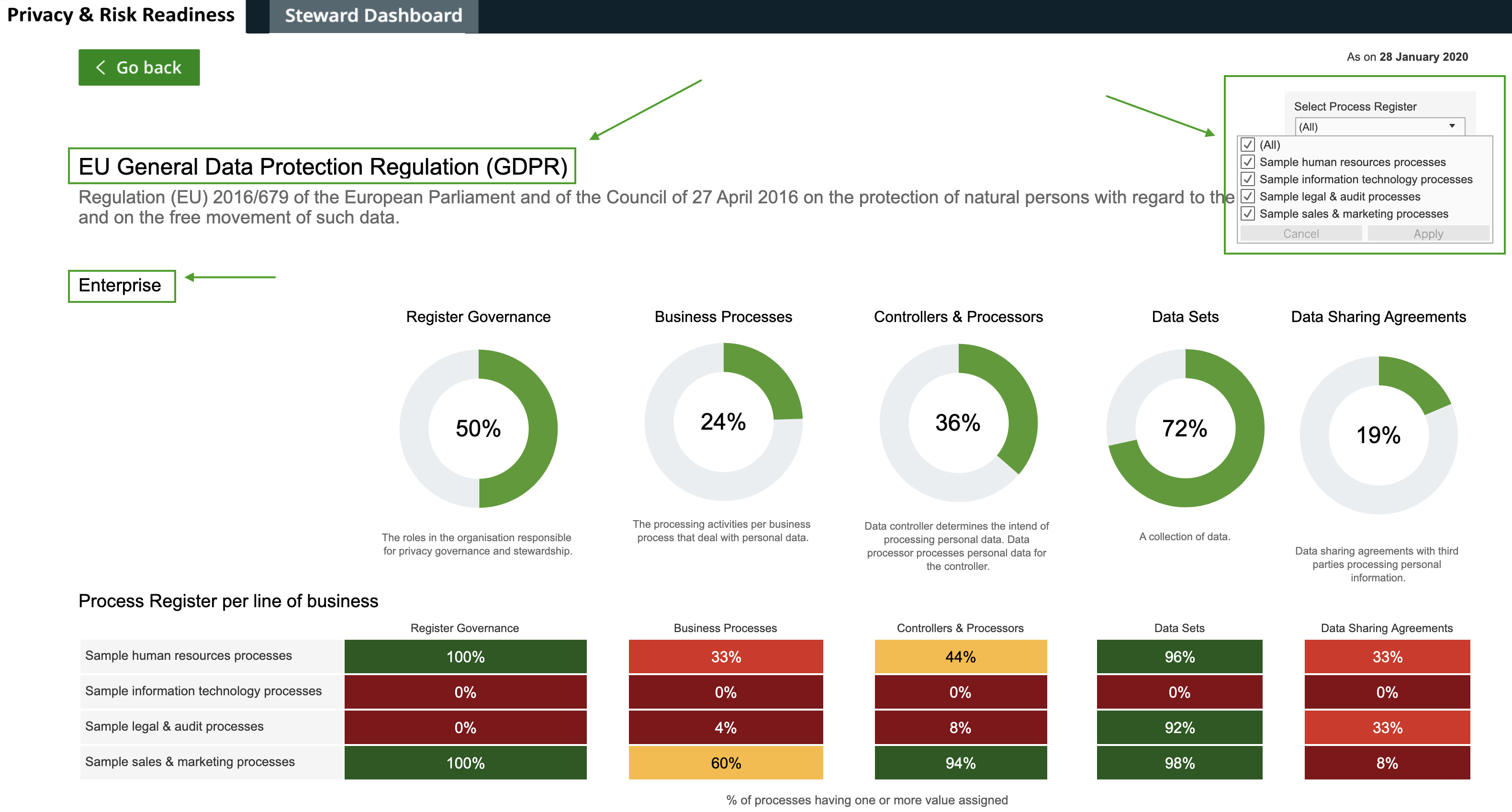 The Privacy & Risk Readiness report helps you to track the development of your organization's data and progress towards compliance with the relevant regulation.