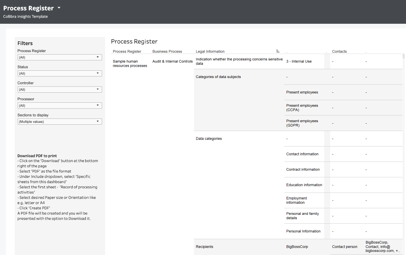 Drilling down further, you can monitor the process registers of specific lines of business, including the business processes, data sets, and third-parties related to a specific process register.