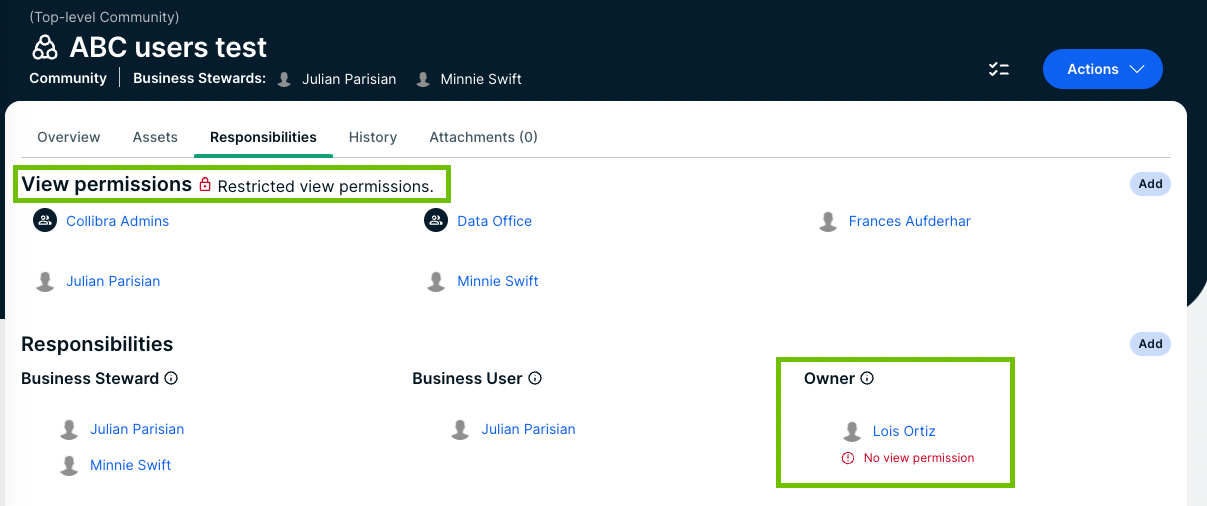 In the example below, Lois Ortiz is the Owner of the ABC users test domain, but she does not have the view permission to see the domain. As a consequence, she cannot see the assets or act on her responsibility. On the Responsibilities page, her responsibility shows an error message to clearly show that there is a problem. You can solve the problem in one of the following ways: