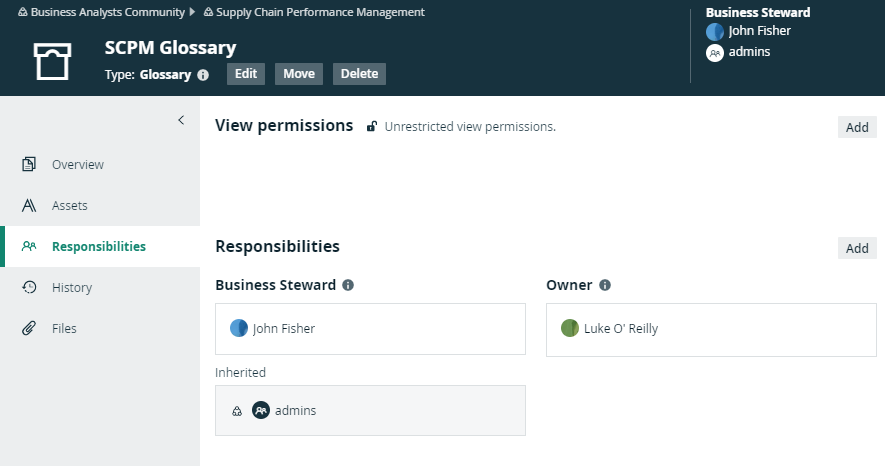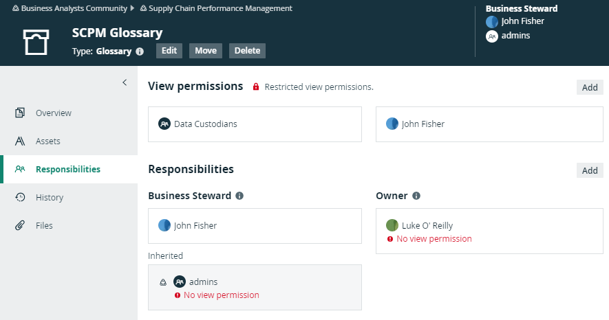 In the example below, Luke O'Reilly is the Owner of the SCPM Glossary domain, but he does not have the view permission to see the domain. As a consequence, he cannot see the assets or act on his responsibility. On the Responsibilities page, his responsibility shows an error message to clearly show that there is a problem. You can solve the problem in one of the following ways: