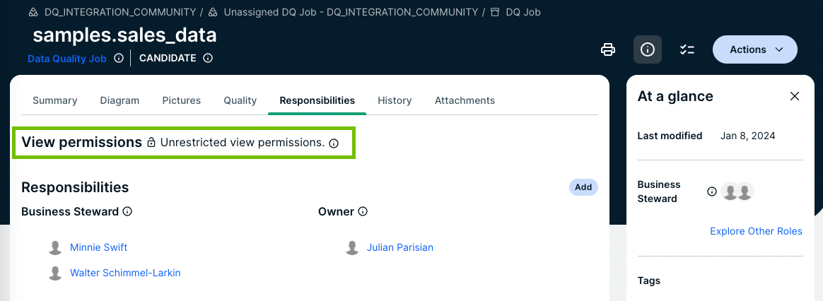 By default, all users can see all resources. If there are no view permissions, the View permissions section of the Responsibilities page of that resource shows Unrestricted view permissions.