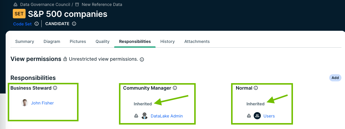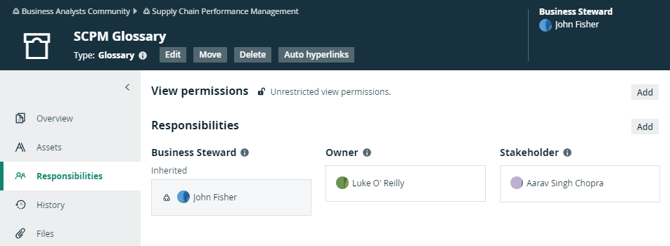- Communities: Responsibilities are inherited by subcommunities, as well as the domains and assets within those communities. For example, if you are a Business Steward for a community, you are also a Business Steward for all its subcommunities, domains, and assets.