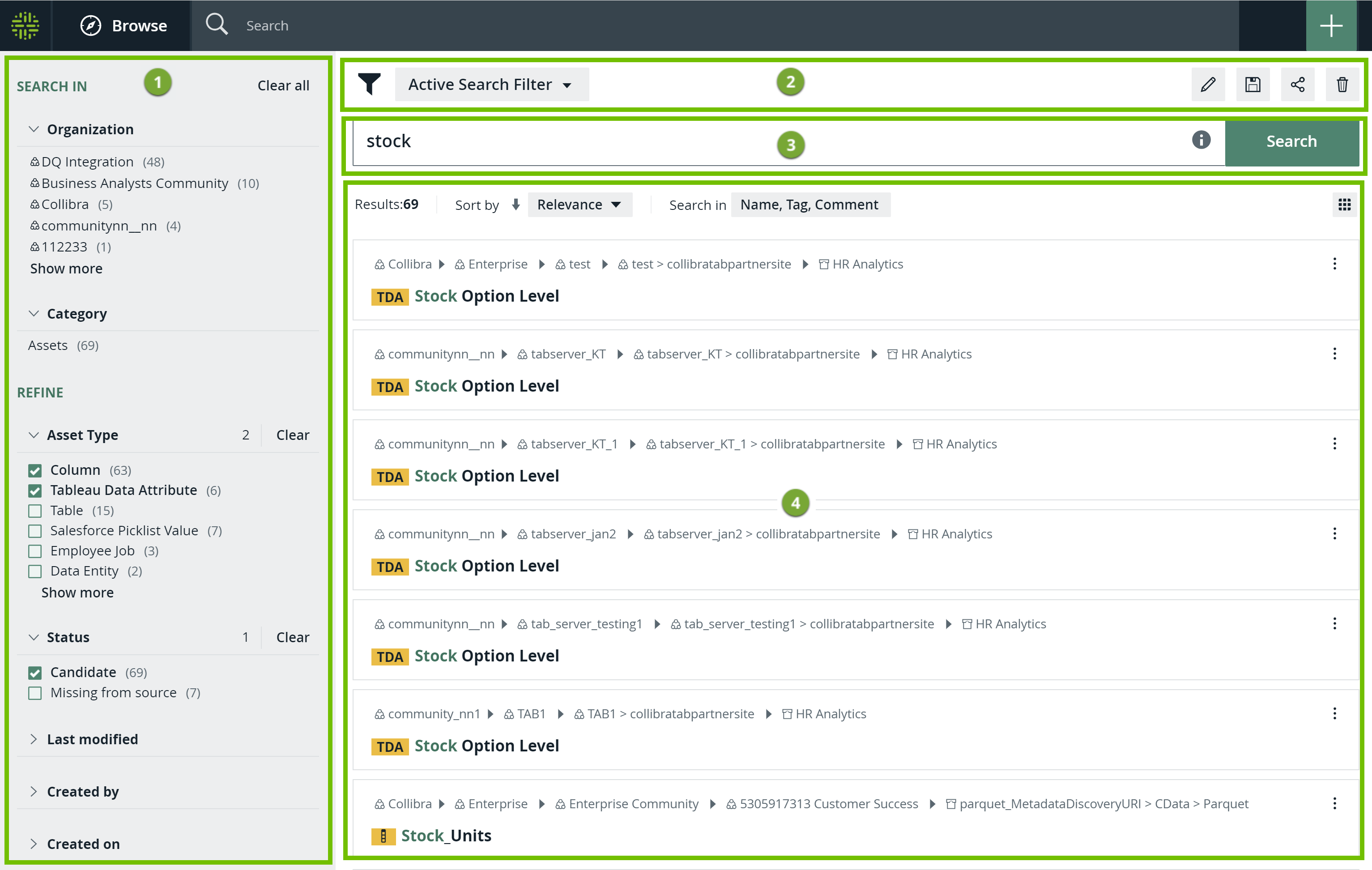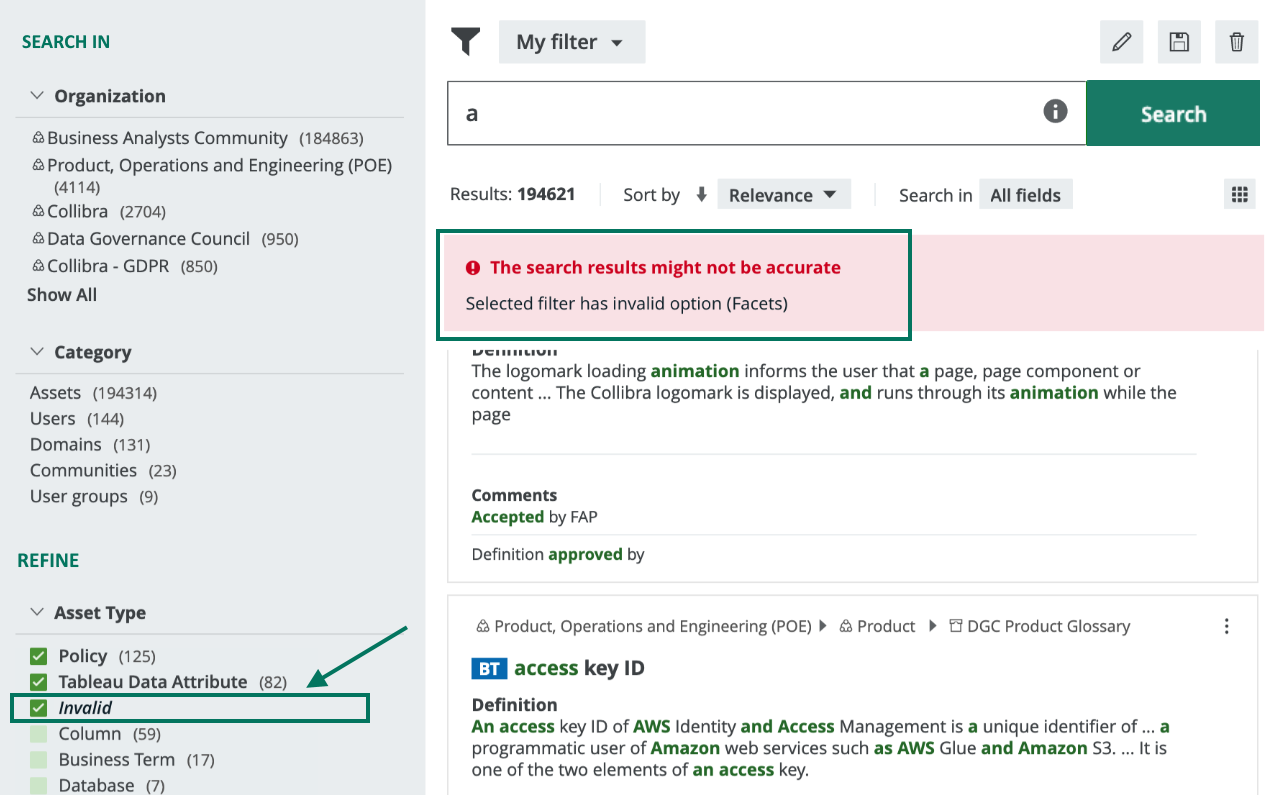 - It is possible that you or another user created a search filter that includes a field or facet that no longer exists in your Collibra environment. When this happens, the unavailable field or facet is highlighted to enable you to identify and remove it from the search filter. Unavailable fields and facets are ignored in search queries.