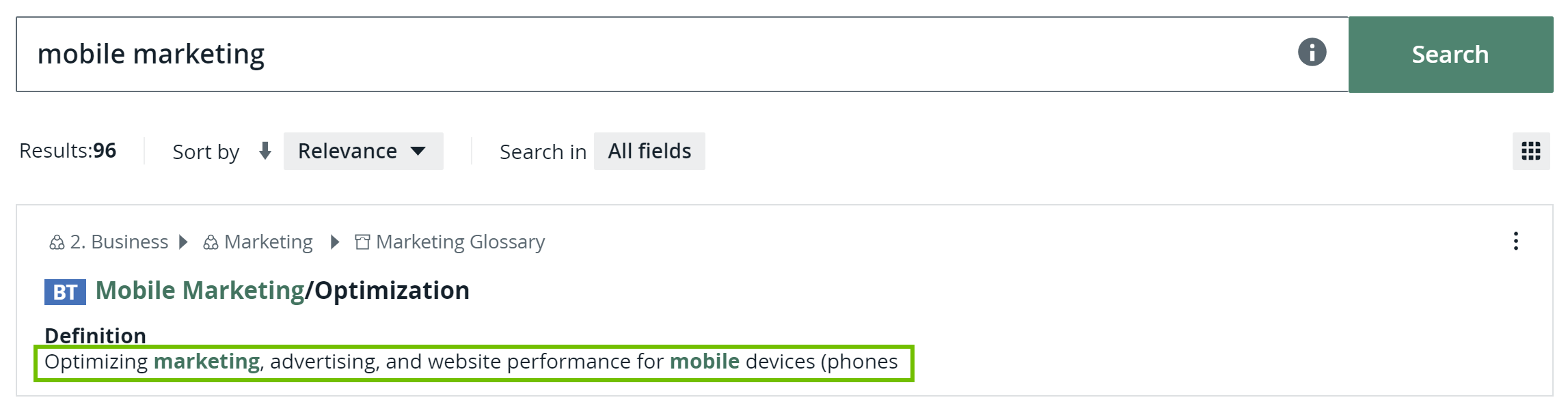 Note If the text in a field is long, the text is shortened when shown in the search results. For example, in the following image, the highlighted definition in the search result shows only a part of the full definition.