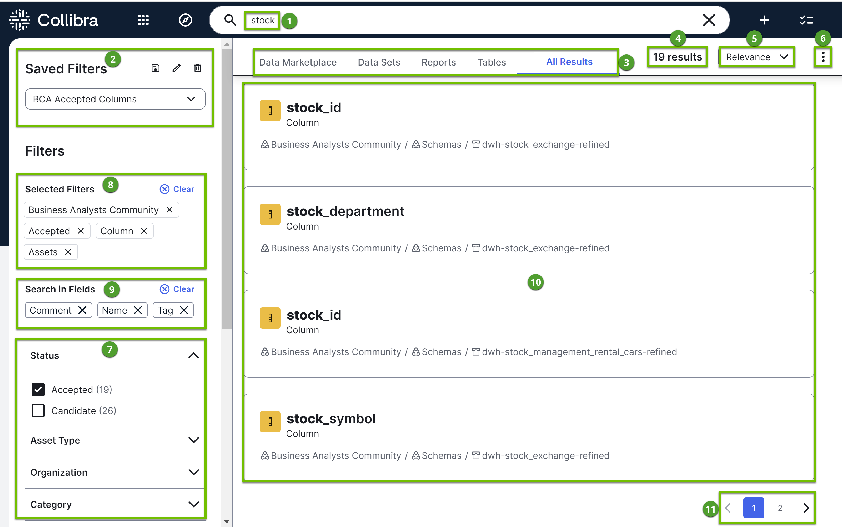 | 1 | Facet pane | A dynamically generated collection of facets that enables you to: