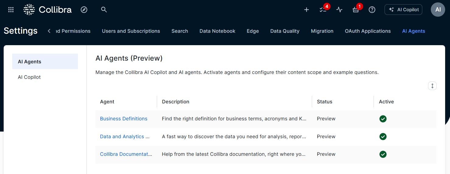 From the AI Agents tab page in the AI Agents settings, you can verify the status of the AI agents in Collibra AI Copilot and activate them.