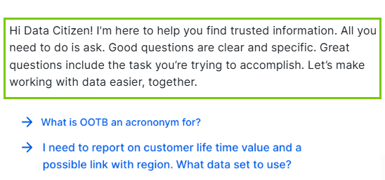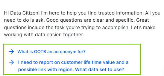 Collibra AI Copilot can show up to 3 clickable example questions. These questions help users understand the types of queries they can ask and allow them to click to see how the AI responds.