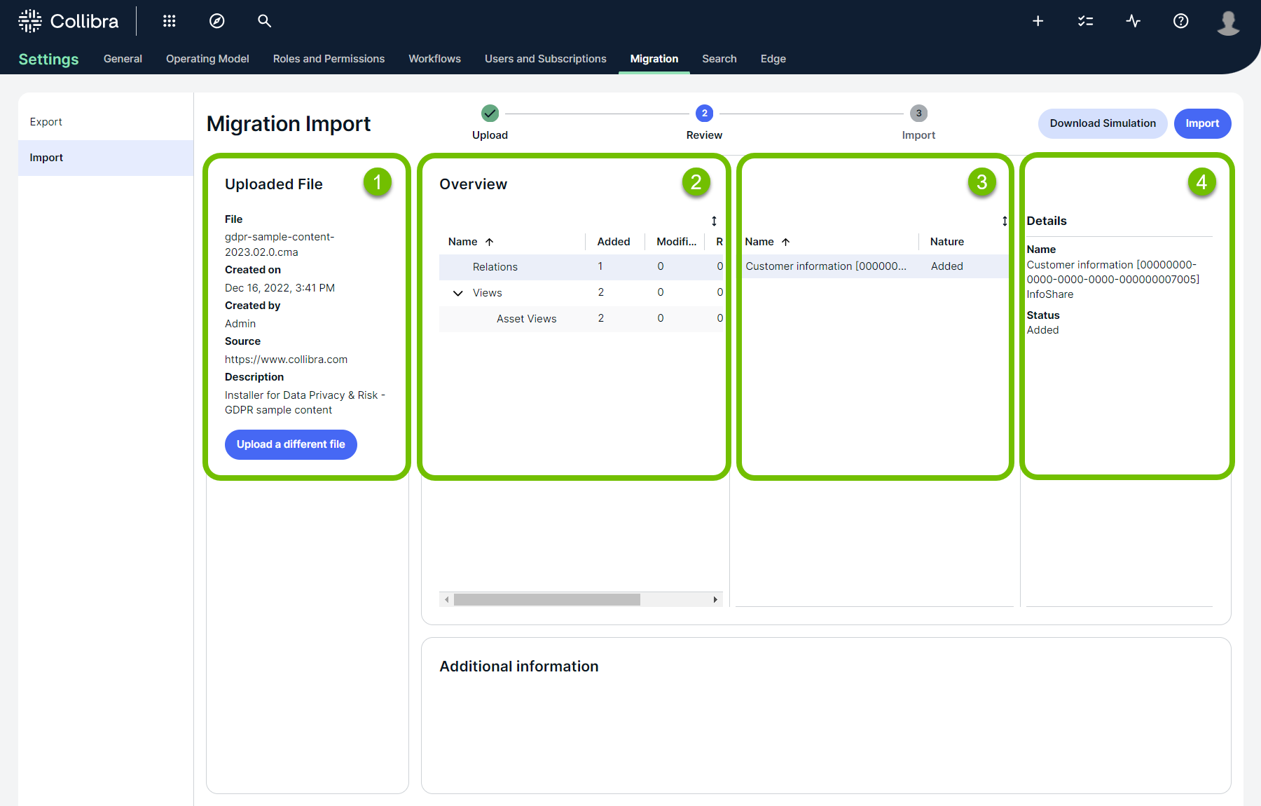 Using the Migration feature, you can import an archive file containing model objects of a Collibra Platform environment.