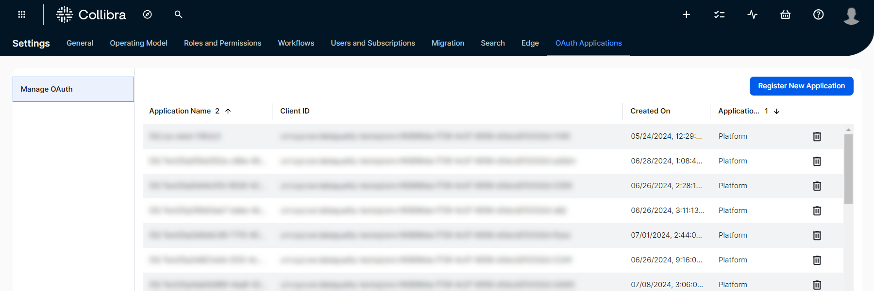 You can securely authenticate your applications to access Collibra public APIs without requiring individual user credentials. The Manage OAuth page allows you to register your applications to obtain a client ID and client secret that are required to request an access token.