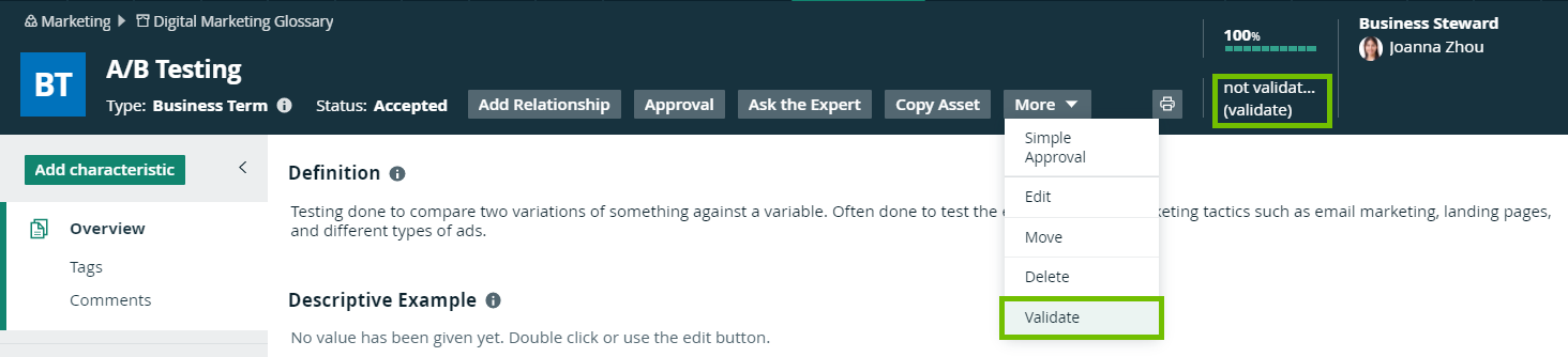 • By default, validation isn't automatically triggered when an asset is edited. Therefore, after editing an asset, you need to revalidate it. You can also create a workflow to automatically revalidate assets based on certain events, for example, when an asset is added or an attribute is edited. For more information, go to Getting started with workflows.