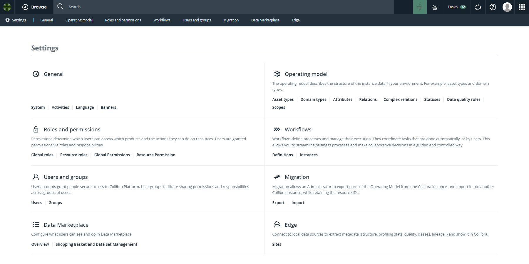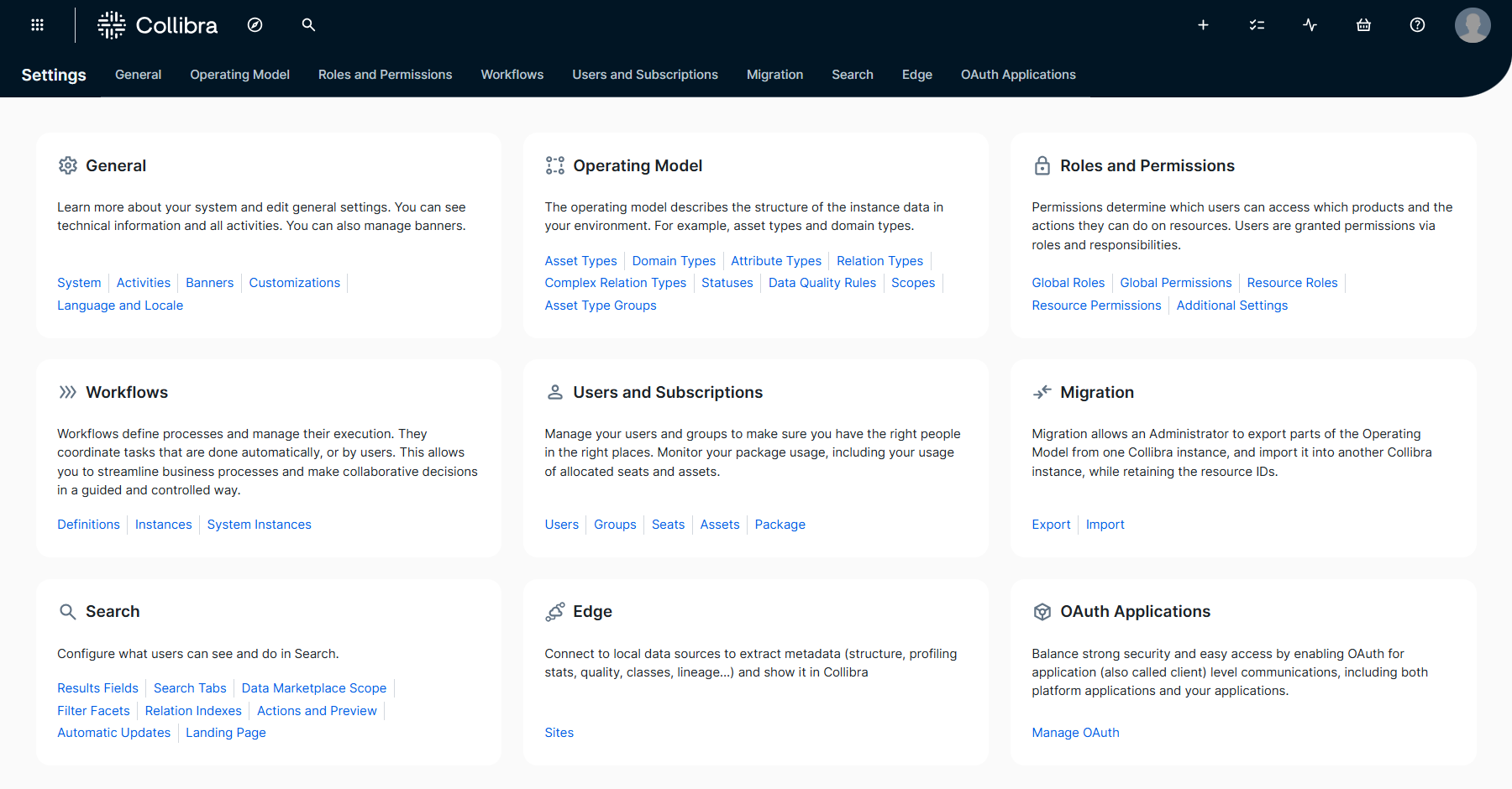 The Collibra settings allow you to customize the operating model and manage your environment according to your needs.