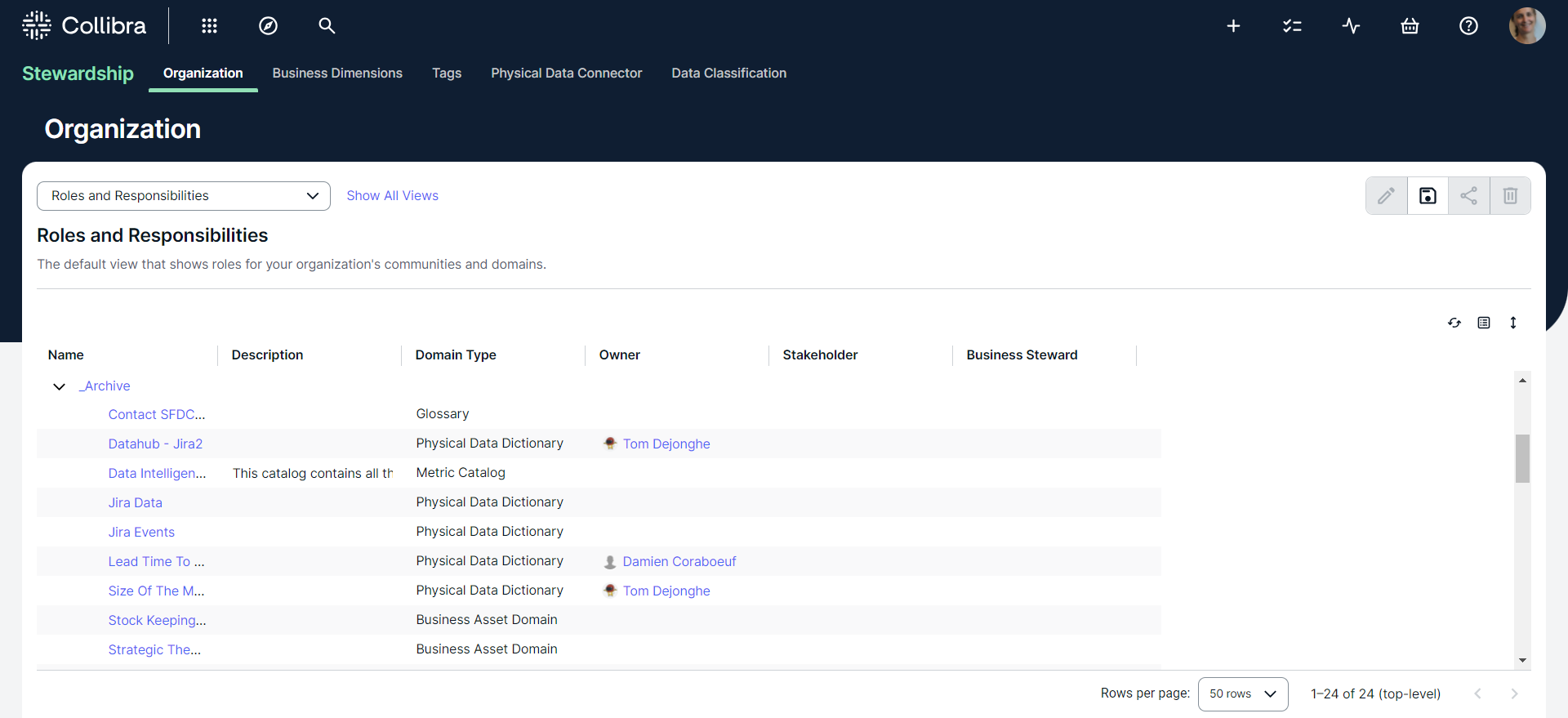 In Stewardship, stewards can monitor and maintain their own space in the company's data governance ecosystem. This space gives a clear picture of the responsibilities inside the data governance structure.