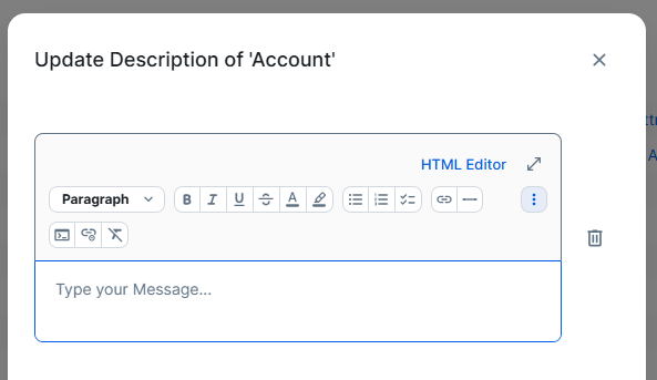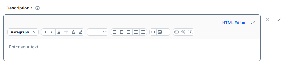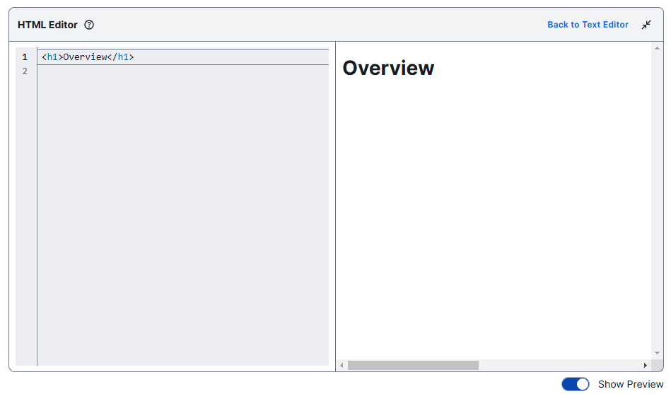 The HTML Editor, if available. Click HTML Editor and enter HTML code. The HTML Editor allows for even more advanced HTML editing, and gives you the option to preview the output. Tip- For a list of HTML tags supported by Collibra, go to HTML tags in text editors and text widgets.
