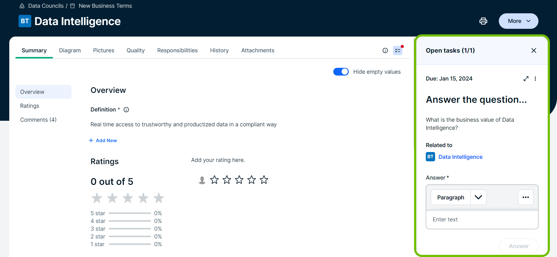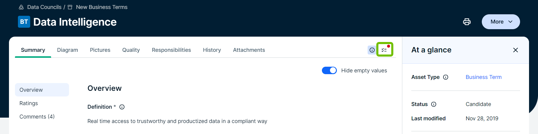 By default, the sidebar displays At a glance information about the asset. If the At a glance sidebar is hidden, click . Unless you are accessing the asset page from the Tasks page or an email notification, select the Tasks icon to display the task in the sidebar. You can complete all task actions from the sidebar.